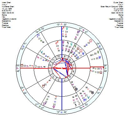 Trattandosi di transiti in coincidenza con il rdx della Repubblica Italiana non vengono alterati i valori e gli obiettivi dei Gemelli in Casa VIII, incrementare le rendite attraverso le invenzioni, il lavoro e la cultura in senso lato. Giove in transito in VI Casa promette buoni risultati dal lavoro attraverso sacrifici superati. La congiunzione Nodo Lunare Nord a Giove promette tali risultati che sono poi il programma di questa legislatura. La Casa V tra Pesci e Ariete la creatività trova alimento dalla fantasia e forza mentale .