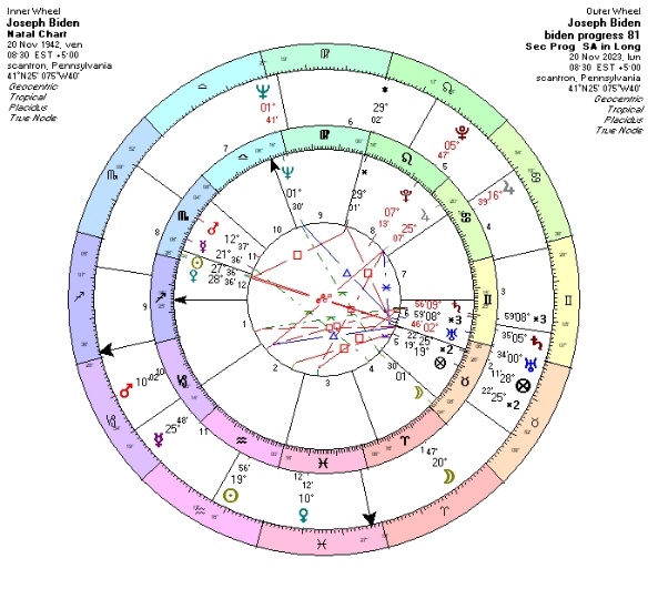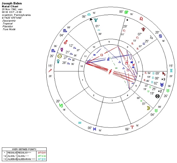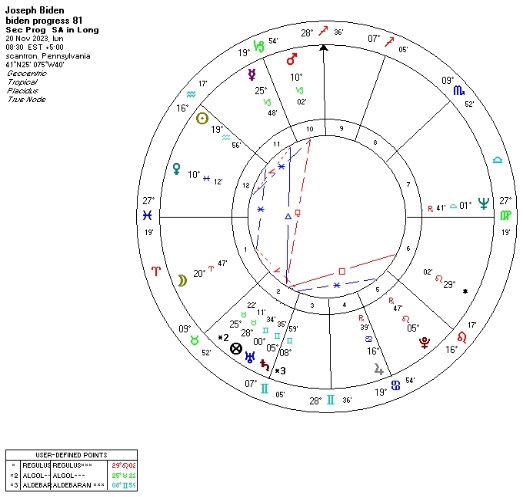 Quindi l’immagine natale di Biden riflessiva, intimistica, caritatevole in XII Casa in Scorpione presenta un’altra faccia nelle braccia dei Gemelli in VI Casa. Non mettendo in secondo piano la stella Aldebaran simbolo di onori, coraggio, apprezzamenti pubblici, poteri, responsabilità politiche e anche tendenza, in qualche periodo, alla violenza.
