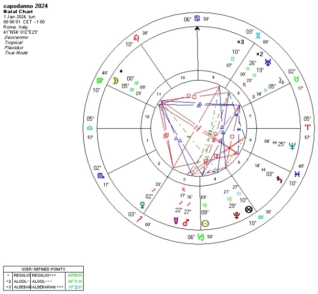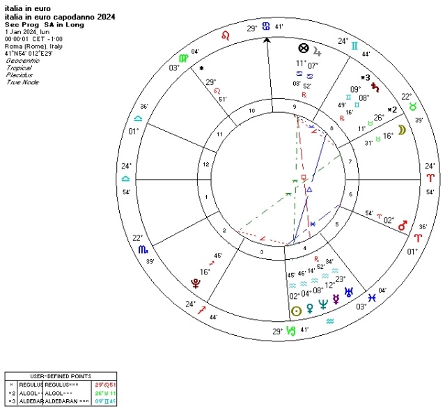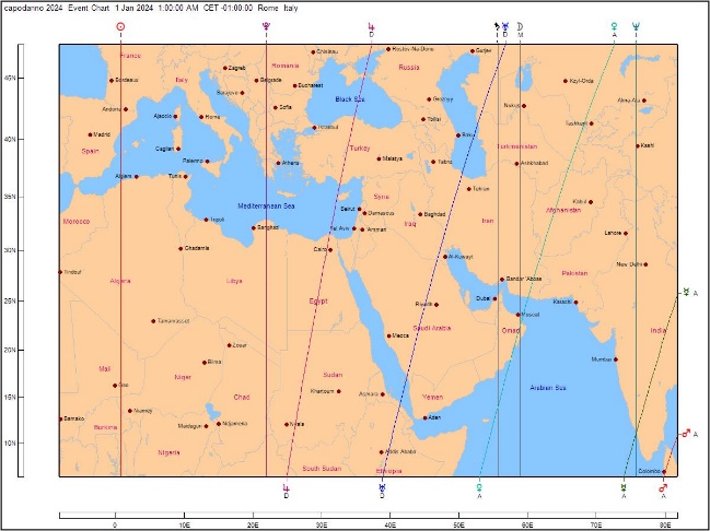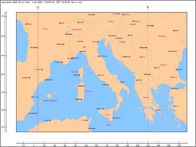 Il Sole e Plutone delimitano l’area geografica dell’Italia creando buone possibilità politiche ed economiche. Sotto questo aspetto l’anno non dovrebbe presentare sorprese.