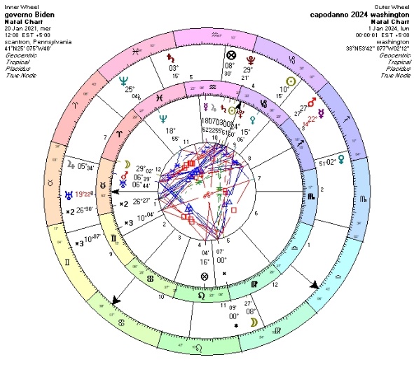 Il governo Biden , stretto tra Saturno e Sole con al centro la Luna, avrà un anno complicato e difficile. L’autorità del Presidente si scontrerà con il movimento di parte della popolazione che non accetterà più le ingenti spese belliche destinate sempre più verso la Ucraina e per poco tempo ancora verso Israele. Saturno è una colonna di marmo e acciaio, non si muove e non accetta più i compromessi. Una possibile crisi potrebbe essere dietro l’angolo, timore paventato dal mondo economico con il rischio di esserne coinvolto da un momento all’altro. In questo clima di incertezza potrebbero fortificarsi le basi, per un nuovo assetto economico, da parte del mondo del BRICS allargato ai paesi arabi straricchi, per cominciare a rosicchiare lo strapotere del dollaro e dell’euro.