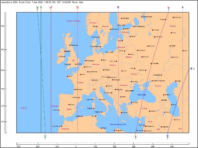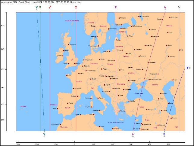 Le linee di Sole e Plutone sono state già analizzate, delimitano la zona centrale dell’Europa interessante i Paesi che più contano. Ma l’Europa comprende anche gli Stati bagnati dall’Oceano Atlantico, quelli del Mediterraneo e quelli confinanti con la Russia ex URSS. Per cui al Sole e Plutone si aggiungono Marte a Ovest e Giove a Est.